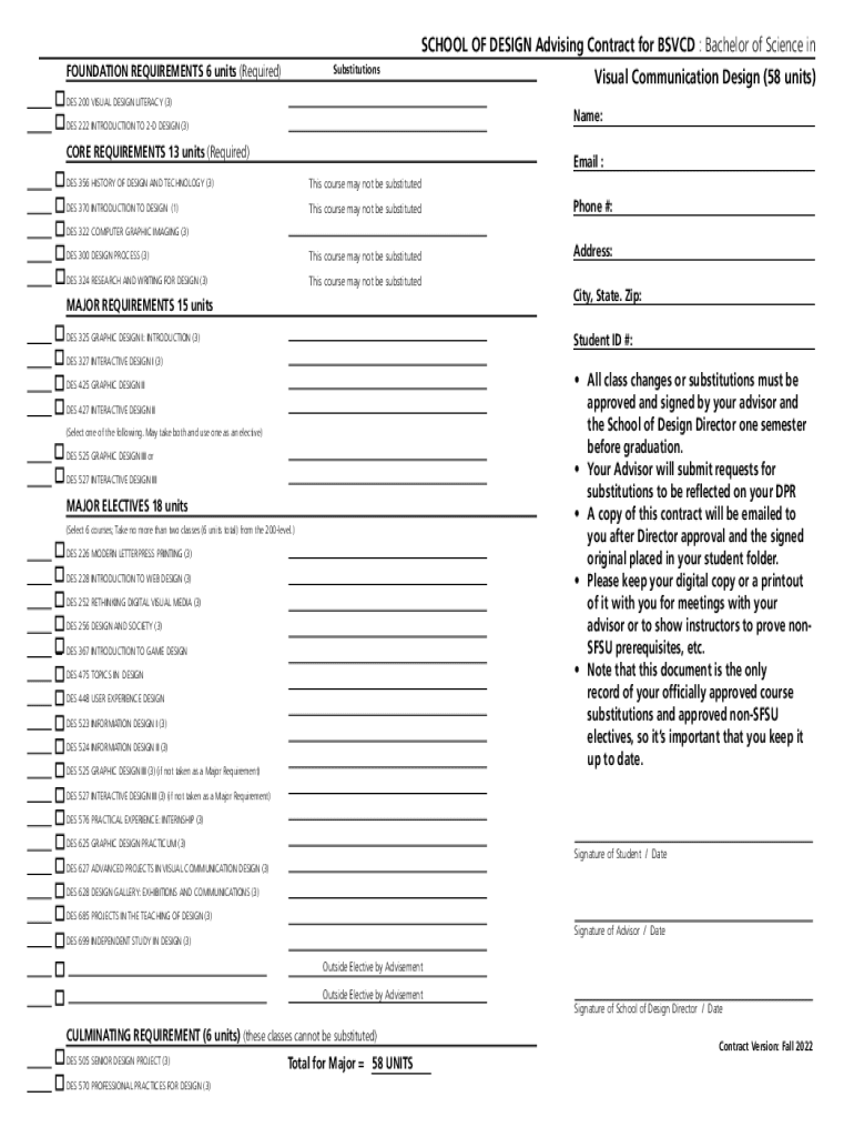SCHOOL OF DESIGN Advising Contract for SVCD : Bachelor of Science in FOUNDATION REQUIREMENTS 6 units (Required)Substitutions DES 200 VISUAL DESIGN LITERACY (3) DES 222 INTRODUCTION TO 2D DESIGN (3)Name:CORE