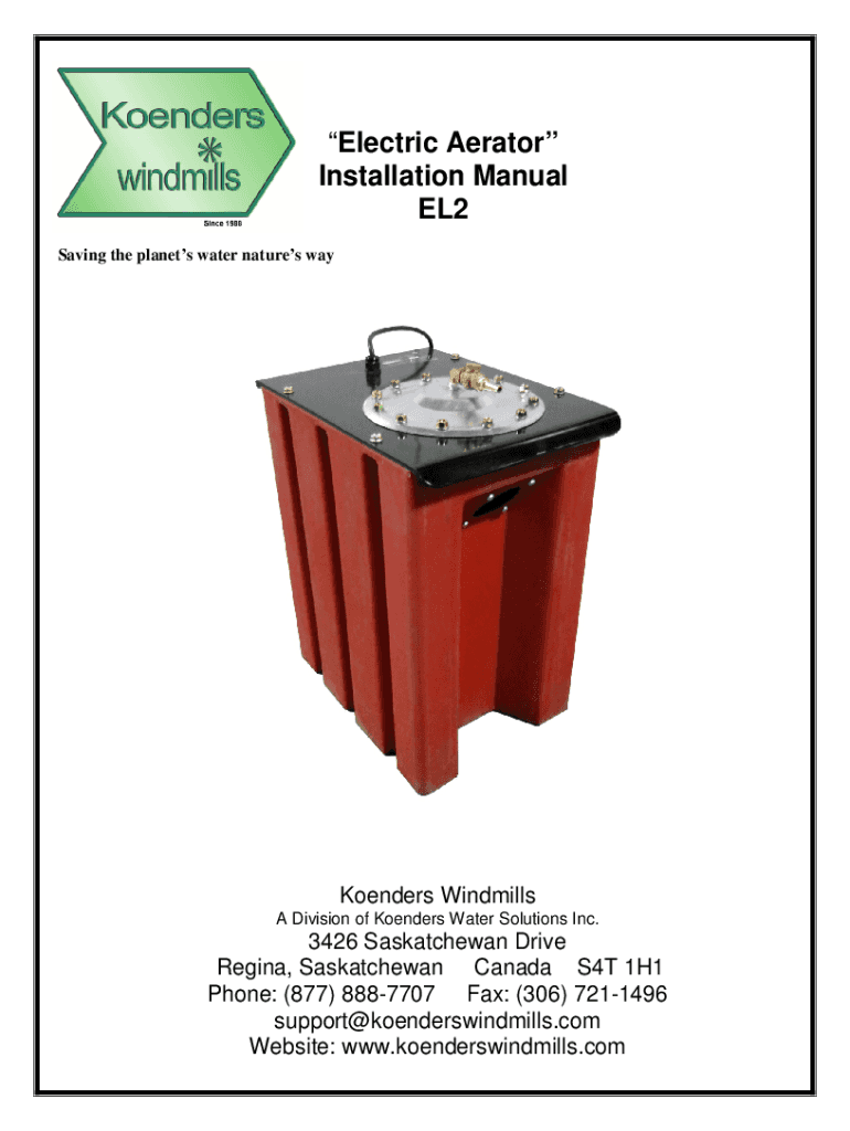 Electric Aerator Installation Manual EL2 Saving the planets water natures weekenders Windmills A Division of Founders Water Solutions Inc.3426 Saskatchewan Drive Regina, Saskatchewan Canada S4T 1H1