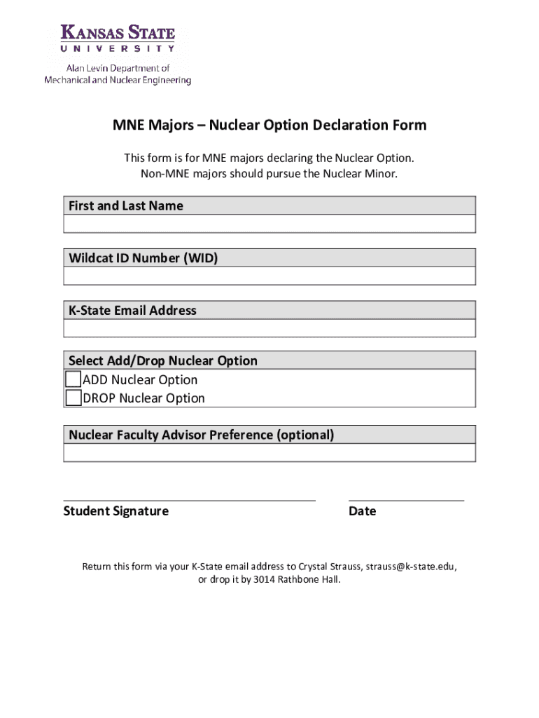 MNE Majors Nuclear Option Declaration Form This form is for MNE majors declaring the Nuclear Option. NonMNE majors should pursue the Nuclear Minor. First and Last Name Wildcat ID Number (DID) State