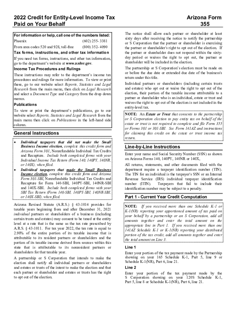 2022 Credit for EntityLevel Income Tax Paid on Your Behalf For information or help, call one of the numbers listed: Phoenix (602) 255 3381 From area codes 520 and 928, toll-free (800) 352 4090 Tax