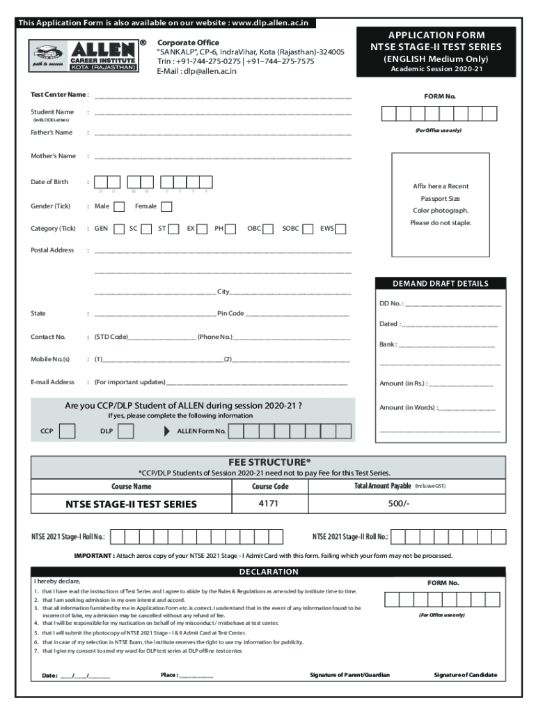 Get the free application form ntse stage-ii test series - Allen DLP - dlp allen ac