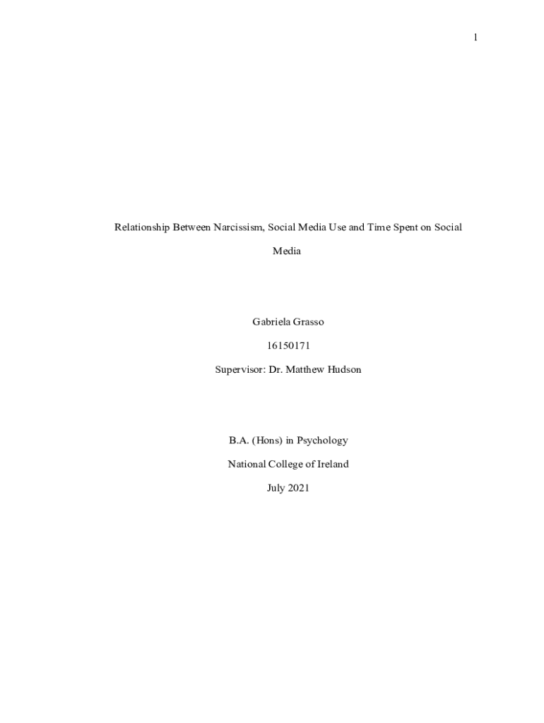 1Relationship Between Narcissism, Social Media Use and Time Spent on Social Media Gabriela Grass 16150171 Supervisor: Dr. Matthew Hudson. A. (Hons) in Psychology National College of Ireland July 20212Submission