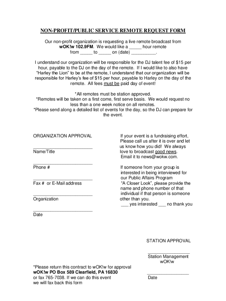 NONPROFIT/PUBLIC SERVICE REMOTE REQUEST FORM Our nonprofit organization is requesting a live remote broadcast from wok!w 102.9FM. We would like a ___ hour remote from ___ to ___ on (date) ___. I understand