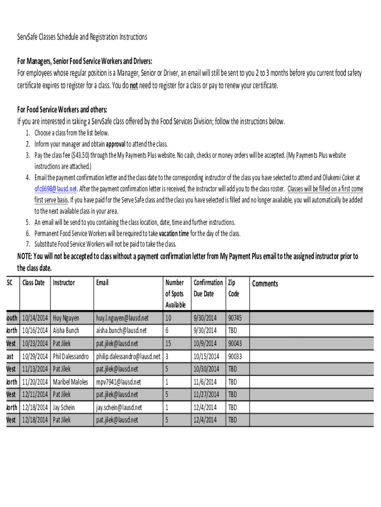 ServSafeClassesScheduleandRegistrationInstructions Co-managers, SeniorFoodServiceWorkersandDrivers: ForemployeeswhoseregularpositionisaManager, SeniororDriver,anemailwillstillbesenttoyou2to3monthsbeforeyoucurrentfoodsafety