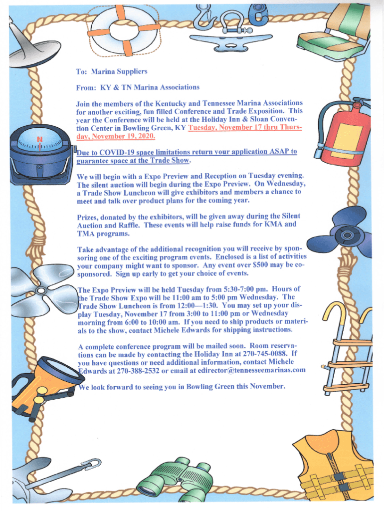To: Marina SuppliersFrom: KY & TN Marina AssociationsJoin the members of the Kentucky and Tennessee Marina Associations for another exit. ING, fun filled Conference and Trade Exposition. This year