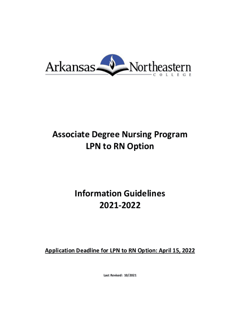 Associate Degree Nursing Program LPN to RN OptionInformation Guidelines 20212022Application Deadline for LPN to RN Option: April 15, 2022Last Revised: 10/2021Arkansas Northeastern College Associate