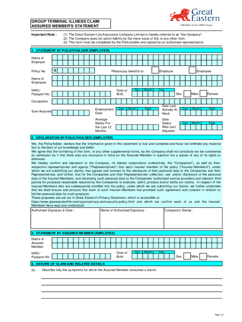 A Member of the OCBC GroupGROUP TERMINAL ILLNESS CLAIM FORM CLAIM SUBMISSION PROCEDURES Please read carefully before you complete the attached Claim Form. 1. The Great Eastern Life Assurance Company