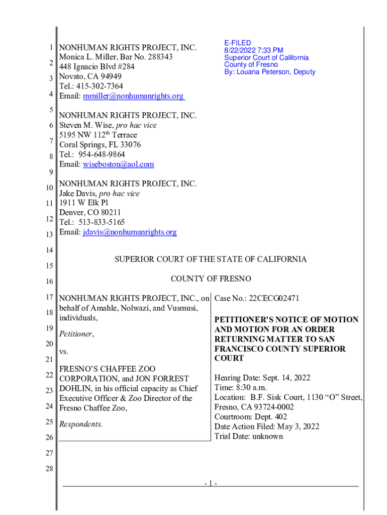 FILED 8/22/2022 7:33 PM Superior Court of California County of Fresno By: Loan Peterson, Deputy1 NONHUMAN RIGHTS PROJECT, INC. Monica L. Miller, Bar No. 288343 448 Ignacio Blvd #284 3 Novato, CA 94949