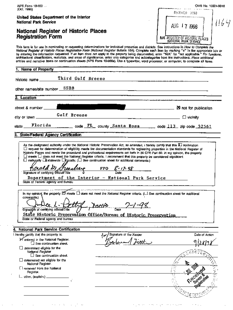 OMB No. 100240018\'IMPS Form 10900 (Oct. 1990) RECEIVEDUnited States Department of the Interior National Park Service2280AU6 I 7 I998National Register of Historic Places Registration Form, FNAT. REGISTER