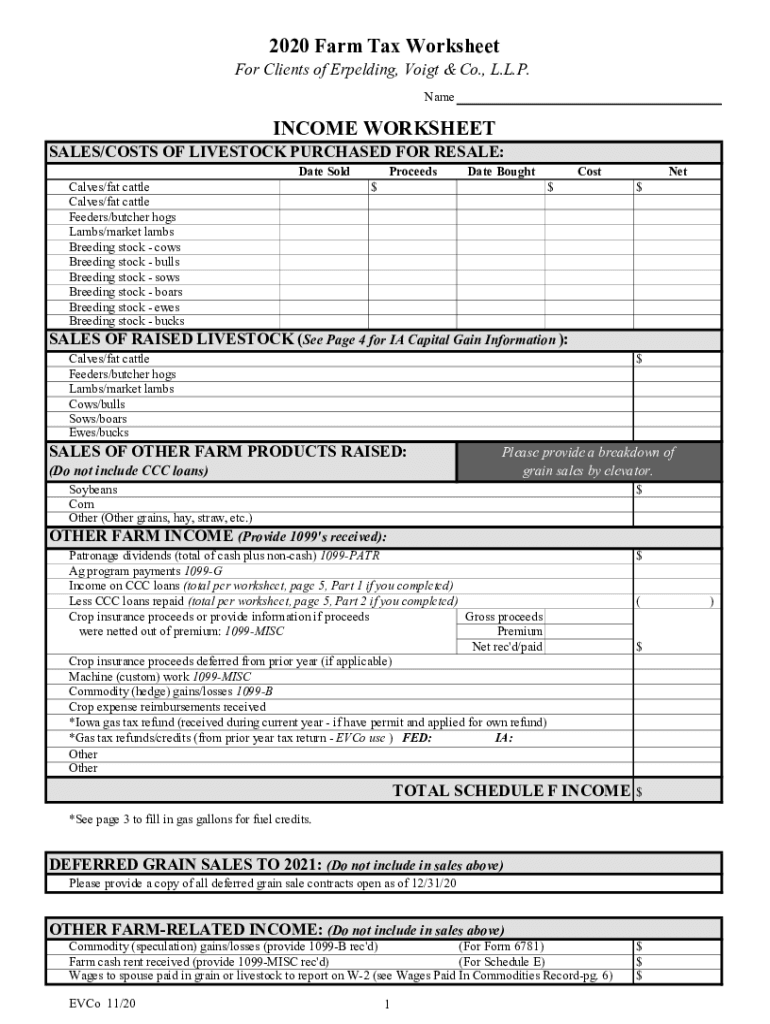 2020 Farm Tax Worksheet Clients of Expelling, Vogt & Co., L.L.P. NameINCOME WORKSHEETSALES/COSTS OF LIVESTOCK PURCHASED FOR RESALE: Calves/fat cattle Calves/fat cattle Feeders/butcher hogs Lambs/market