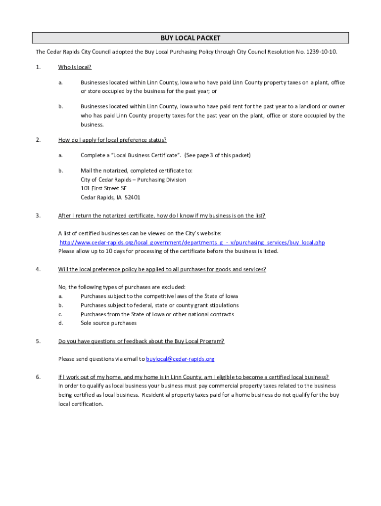 BUY LOCAL PACKET The Cedar Rapids City Council adopted the Buy Local Purchasing Policy through City Council Resolution No. 12391010. 1.2.3. Who is local? a. Businesses located within Line County,