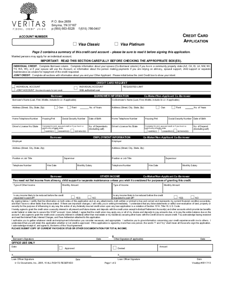Veritas FCU Visa application is a form used to apply for a Visa credit card from Veritas Federal Credit Union.