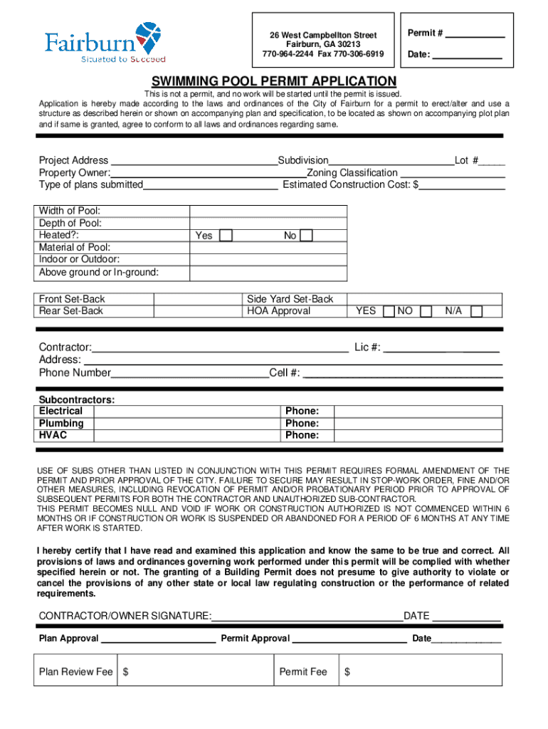 26 West Campbell ton Street Fair burn, GA 30213 7709642244 Fax 7703066919Permit # Date:SWIMMING POOL PERMIT APPLICATION This is not a permit, and no work will be started until the permit is issued.