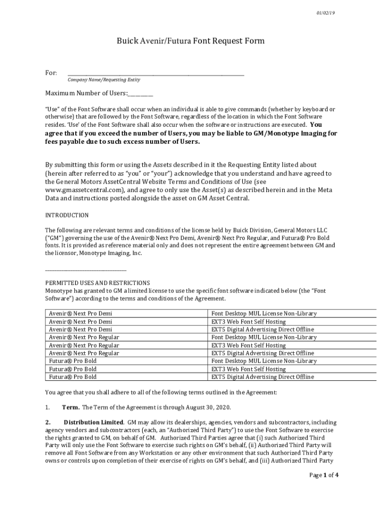 01/02/19Buick Avenge/Future Font Request Former:___Company Name/Requesting EntityMaximum Number of Users:___Use of the Font Software shall occur when an individual is able to give commands (whether