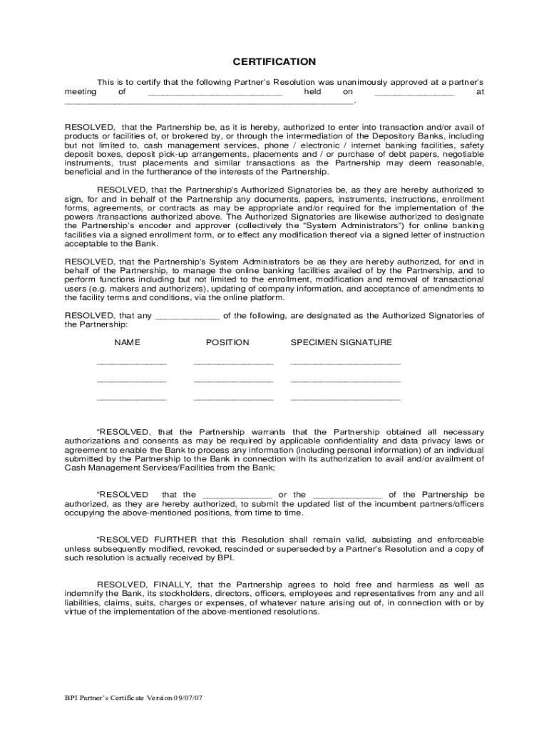 CERTIFICATION This is to certify that the following Partners Resolution was unanimously approved at a partners meeting of ___ held on ___ at ___.RESOLVED, that the Partnership be, as it is hereby,