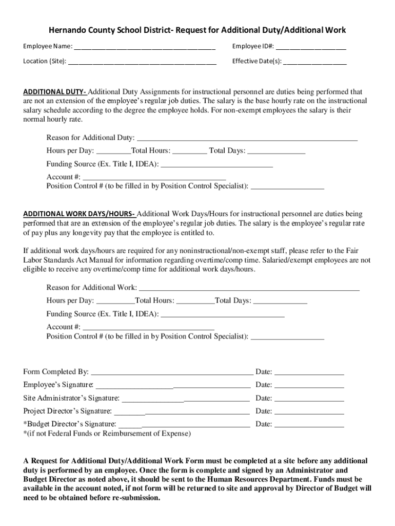 Hernando County School District Request for Additional Duty/Additional Work Employee Name: ___Employee ID#: ___Location (Site): ___Effective Date(s): ___ADDITIONAL DUTY Assignments for instructional
