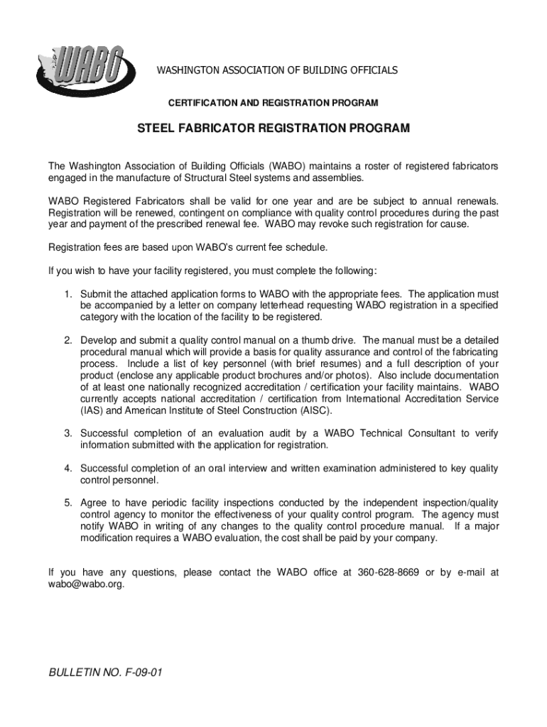 WASHINGTON ASSOCIATION OF BUILDING OFFICIALS CERTIFICATION AND REGISTRATION PROGRAMSTEEL FABRICATOR REGISTRATION PROGRAM The Washington Association of Building Officials (WACO) maintains a roster