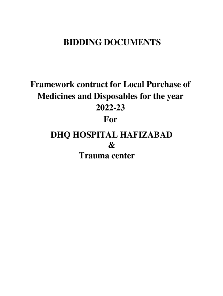 BIDDING DOCUMENTSFramework contract for Local Purchase of Medicines and Disposables for the year 202223 For HQ HOSPITAL HAFIZABAD & Trauma intergender Notice The HQ HOSPITAL HAFIZABAD invites bids