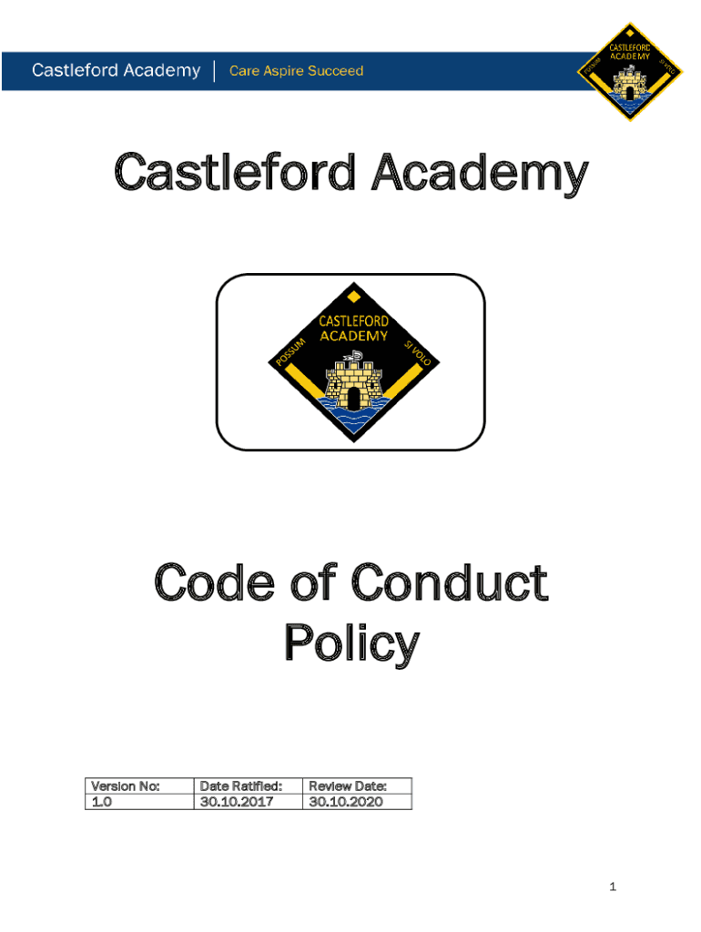 Castle ford AcademyCode of Conduct Policy Version No: 1.0Date Ratified: 30.10.2017Review Date: 30.10.20201Castleford Academy Code of Conduct Policy Table of Contents 1. Legal Framework.4 2. Related