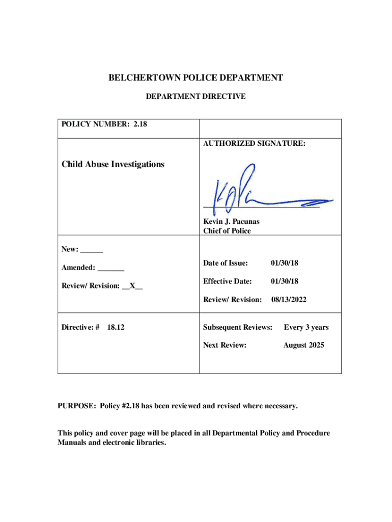 BELCHERTOWN POLICE DEPARTMENT DIRECTIVEPOLICY NUMBER: 2.18 AUTHORIZED SIGNATURE:Child Abuse Investigations Kevin J. Lacunas Chief of Police New: ___ Amended: ___ Review/ Revision: __X__Directive: