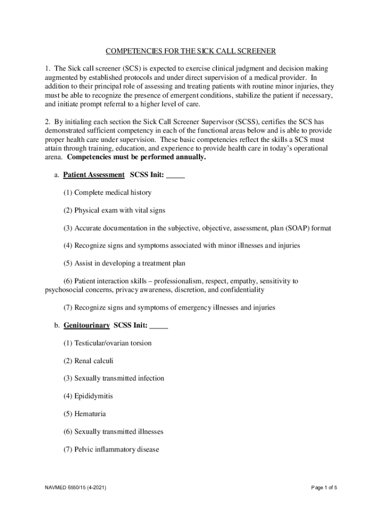 COMPETENCIES FOR THE SICK CALL SCREENER 1. The Sick call screener (SCS) is expected to exercise clinical judgment and decision-making augmented by established protocols and under direct supervision