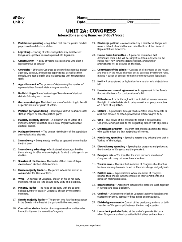 Ago Unit 2Name___ Date___ Per.___UNIT 2A: CONGRESS Interactions among Branches of Govt Vocab 1. Pork barrel spending Legislation that directs specific funds to projects within districts or states.2.
