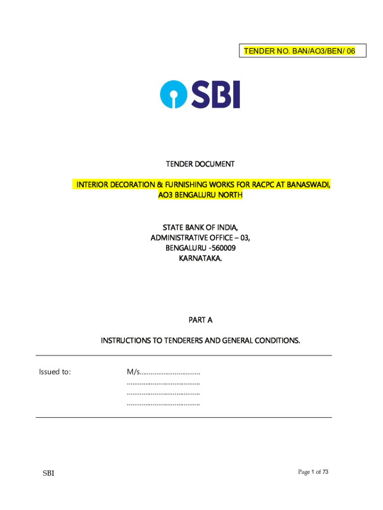 TENDER NO. BAN/AO3/BEN/ 06TENDER DOCUMENT INTERIOR DECORATION & FURNISHING WORKS FOR RAC PC AT ANASAZI, AO3 BENGALURU NORTHSIDE BANK OF INDIA, ADMINISTRATIVE OFFICE 03, BENGALURU 560009 KARNATAKA.PART