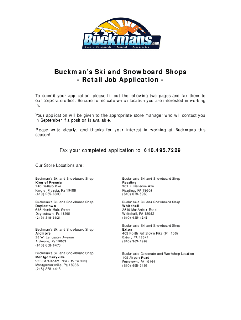 Buck mans Ski and Snowboard Shops Retail Job Application To submit your application, please fill out the following two pages and fax them to our corporate office. Be sure to indicate which location