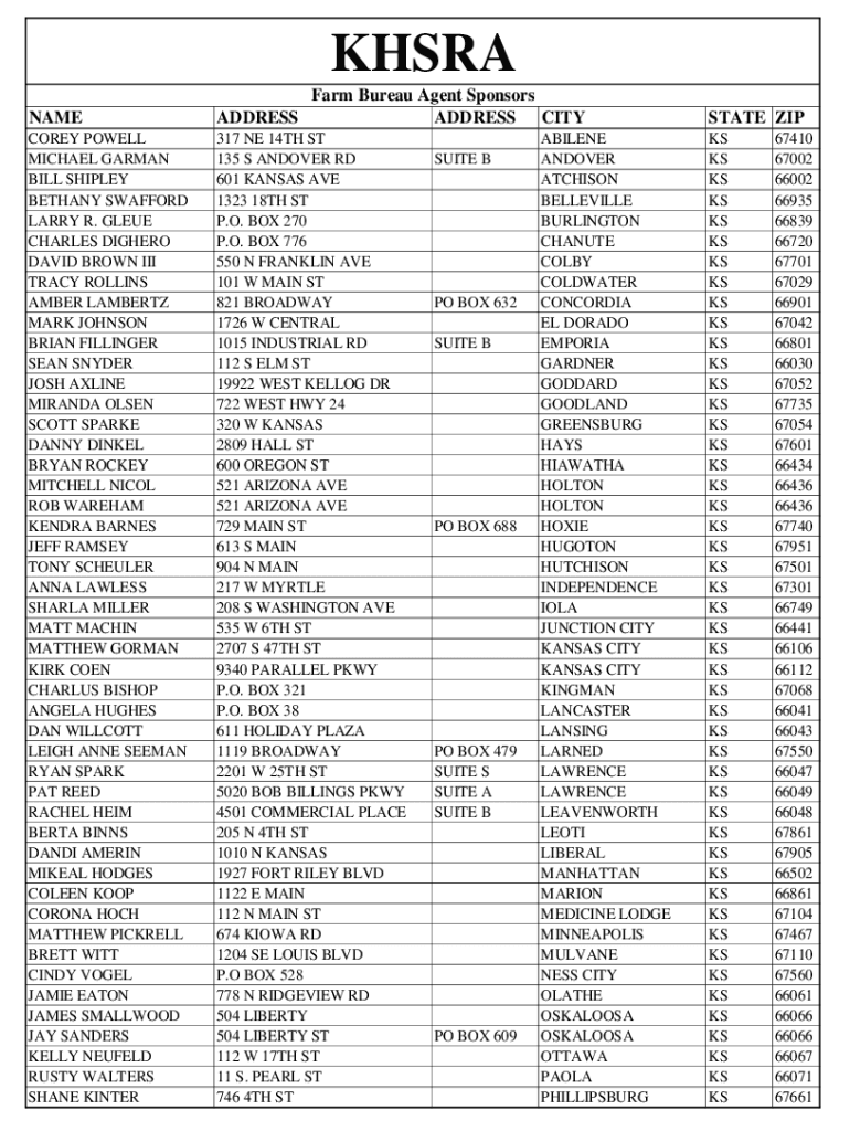 KARA Namesake Bureau Agent Sponsors ADDRESS CITYSCAPE COREY POWELL MICHAEL GERMAN BILL SHIRLEY BETHANY STAFFORD LARRY R. GLUE CHARLES HIGHER DAVID BROWN III TRACY ROLLINS AMBER LAMBERT MARK JOHNSON