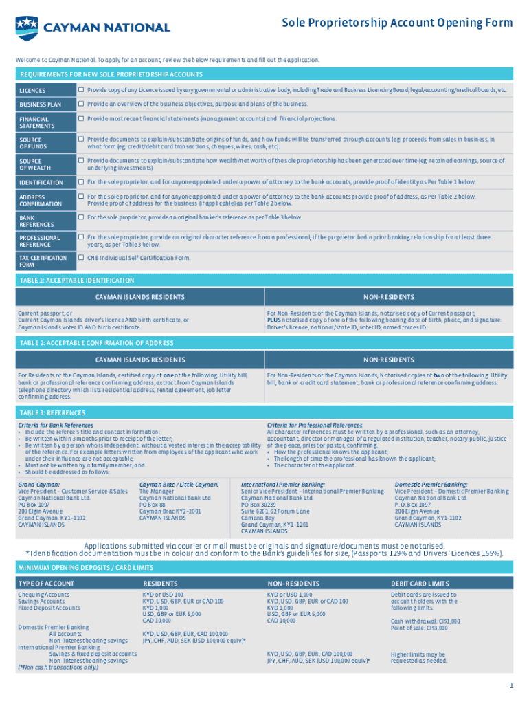 Sole Proprietorship Account Opening Form Welcome to Cayman National. To apply for an account, review the below requirements and fill out the application. REQUIREMENTS FOR NEW SOLE PROPRIETORSHIP ACCOUNTS