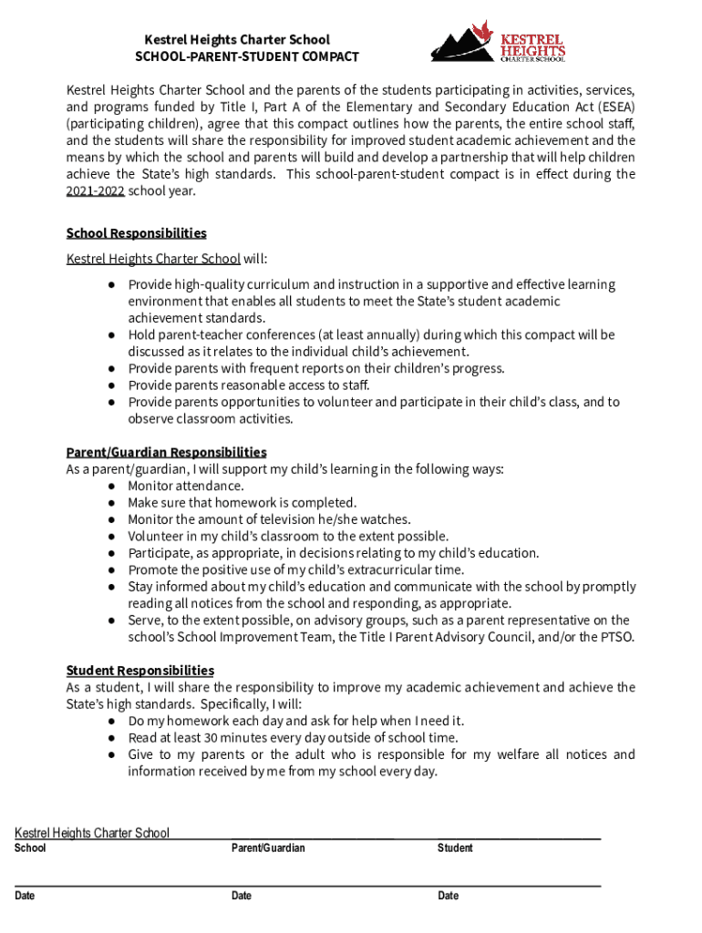 Kestrel Heights Charter School SCHOOLPARENTSTUDENT COMPACT Kestrel Heights Charter School and the parents of the students participating in activities, services, and programs funded by Title I, Part