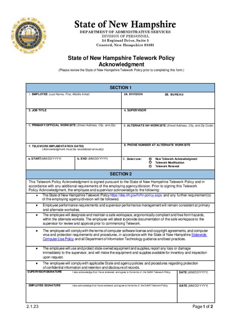 State of New Hampshire DEPARTMENT OF ADMINISTRATIVE SERVICES DIVISION OF PERSONNEL 54 Regional Drive, Suite 5 Concord, New Hampshire 03301State of New Hampshire Telework Policy Acknowledgment (Please