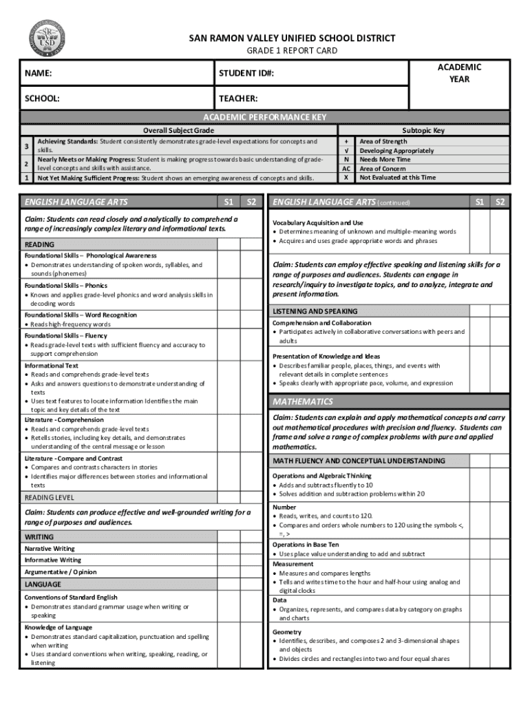 Information such as grades in different subjects, attendance record, behavior, and teacher comments must be reported on grade 1 report card.