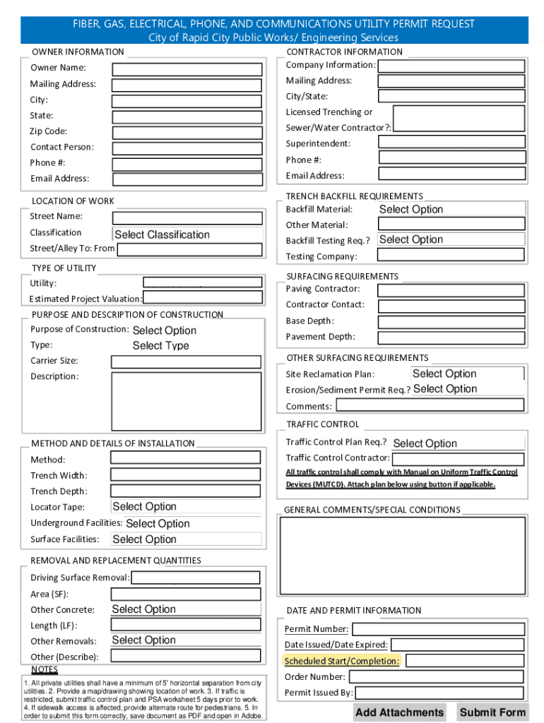 FIBER, GAS, ELECTRICAL, PHONE, AND COMMUNICATIONS UTILITY PERMIT REQUEST City of Rapid City Public Works/ Engineering Services OWNERINFORMATIONCONTRACTORINFORMATION Company Information:Owner Name:Mailing