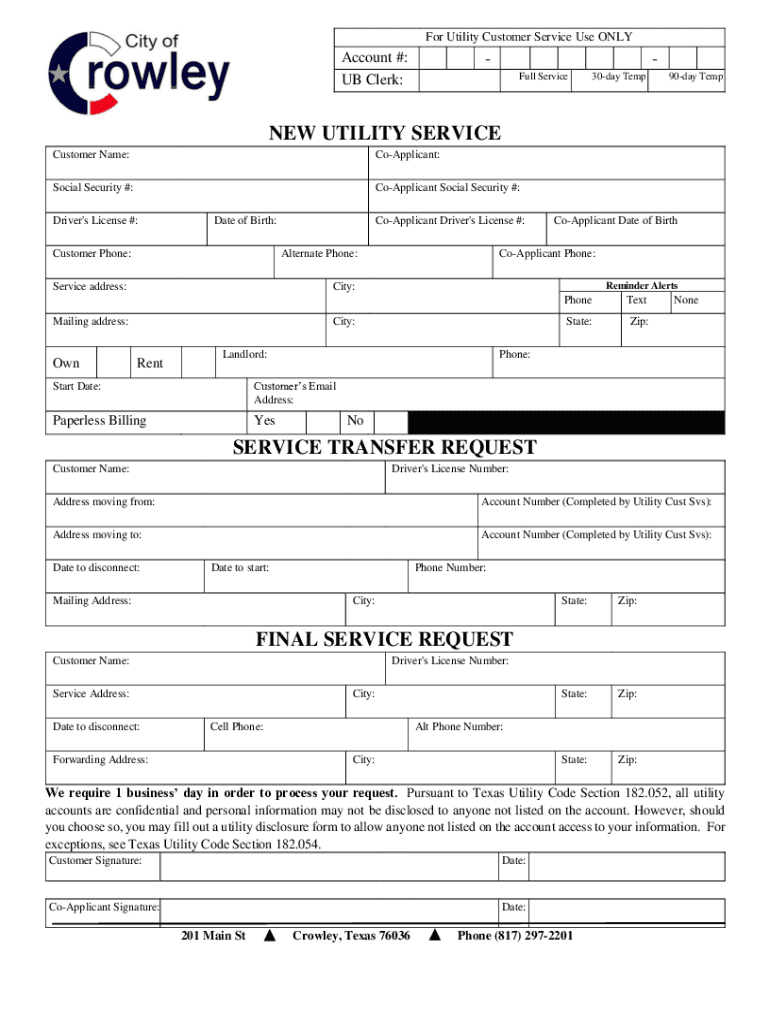 For Utility Customer Service Use ONLYAccount #: UP Clerk:Full Service30day Temp90day Temple UTILITY SERVICE Customer Name:Applicant:Social Security #:Applicant Social Security #:Driver\'s License