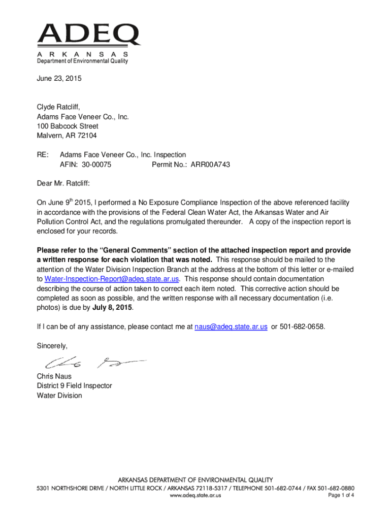 June 23, 2015Clyde Ratliff, Adams Face Veneer Co., Inc. 100 Babcock Street Tavern, AR 72104 RE:Adams Face Veneer Co., Inc. Inspection AKIN: 3000075 Permit No.: ARR00A743Dear Mr. Ratliff: On June 9th