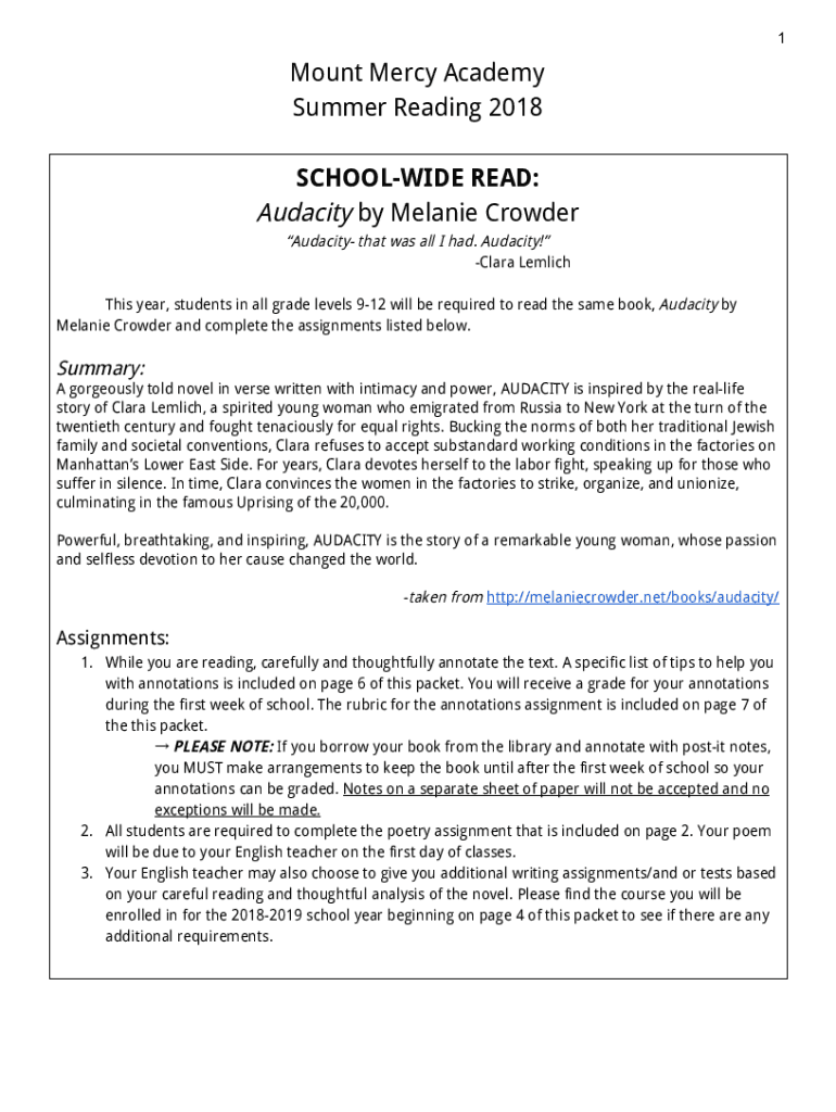 1Mount Mercy Academy Summer Reading 2018 SCHOOLKID READ: Audacity by Melanie Crowder Audacity that was all I had. Audacity! Clara Heimlich This year, students in all grade levels 912 will be required