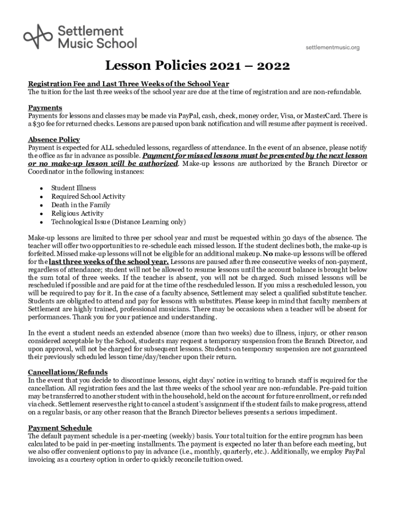 Lesson Policies 2021 2022 Registration Fee and Last Three Weeks of the School Year The tuition for the last three weeks of the school year are due at the time of registration and are nonrefundable.