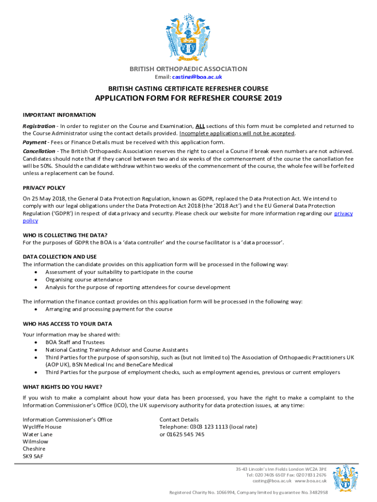 BRITISH Orthopedic ASSOCIATION Email: casting@boa.ac.ukBRITISH CASTING CERTIFICATE REFRESHER COURSEAPPLICATION FORM FOR REFRESHER COURSE 2019 IMPORTANT INFORMATION Registration In order to register