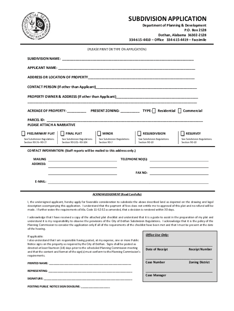 SUBDIVISION APPLICATIONDepartment of Planning & Development P.O. Box 2128 Dothan, Alabama 363022128 3346154410 Office 3346154419 Facsimile(PLEASE PRINT OR TYPE ON APPLICATION)SUBDIVISION NAME: ___