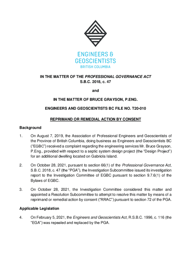 IN THE MATTER OF THE PROFESSIONAL GOVERNANCE ACT S.B.C. 2018, c. 47 and IN THE MATTER OF BRUCE GRAYSON, P.ENG. ENGINEERS AND GEOSCIENTISTS BC Files NO. T20010 REPRIMAND OR REMEDIAL ACTION BY CONSENT