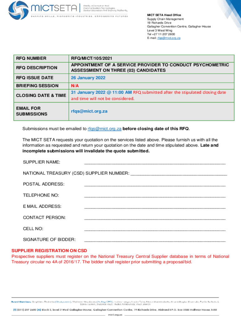 MICE SET Head Office Supply Chain Management 19 Richards Drive Gallagher Convention Center, Gallagher House Level 3 West Wing Tel +27 11 207 2600 Email: rfqs@mict.org.zaRFQ NUMBER/MICE/105/2021RFQ