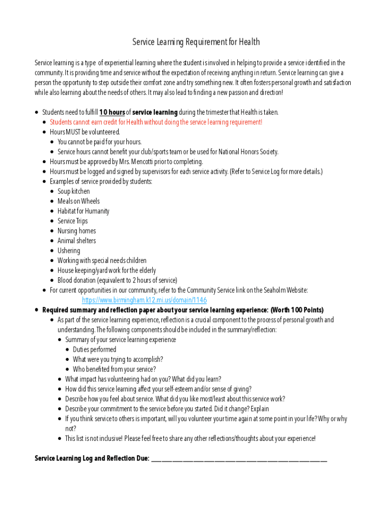 Service Learning Requirement for Health Service learning is a type of experiential learning where the student is involved in helping to provide a service identified in the community. It is providing