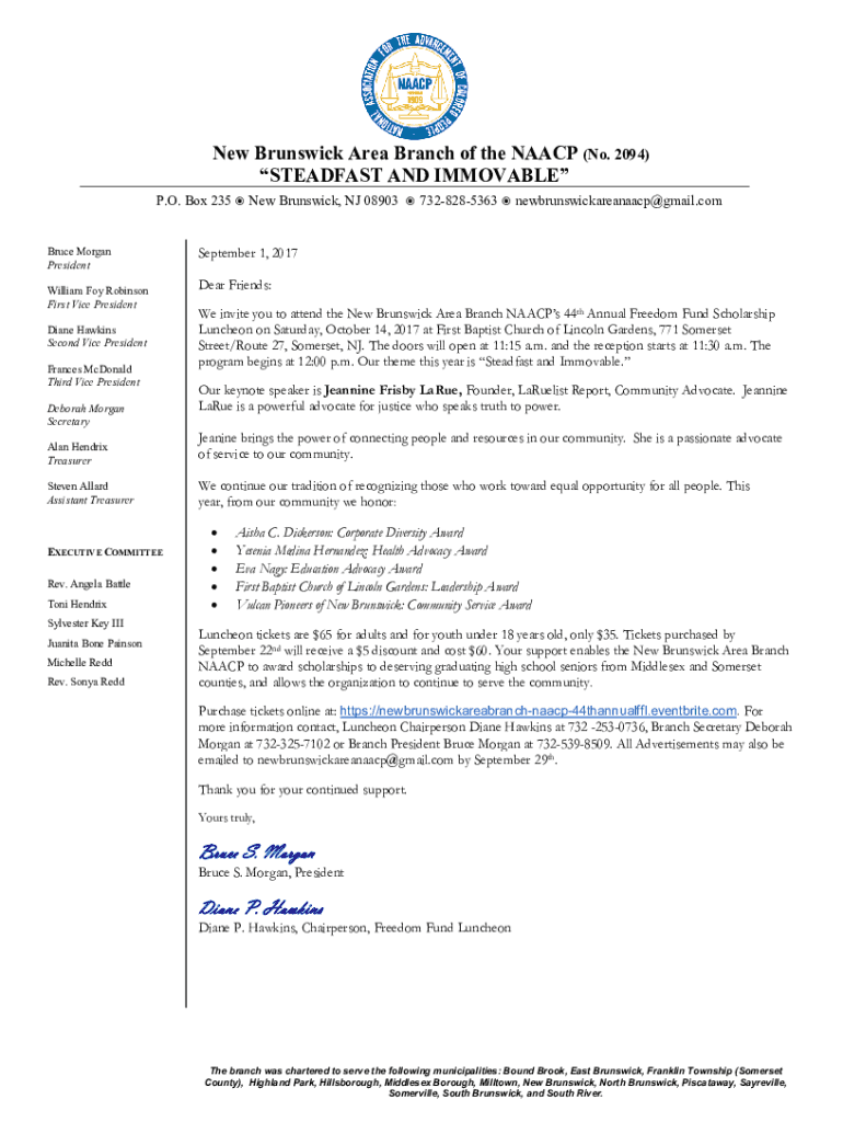 New Brunswick Area Branch of the NAACP (No. 2094) STEADFAST AND IMMOVABLE P.O. Box 235 New Brunswick, NJ 08903 7328285363 newbrunswickareanaacp@gmail.com Bruce Morgan President William For Robinson
