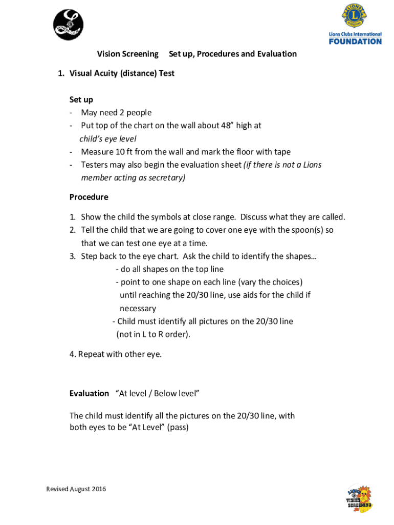 Vision Screening Set up, Procedures and Evaluation1. Visual Acuity (distance) Test Set up May need 2 people Put top of the chart on the wall about 48 high at children eye level Measure 10 ft from
