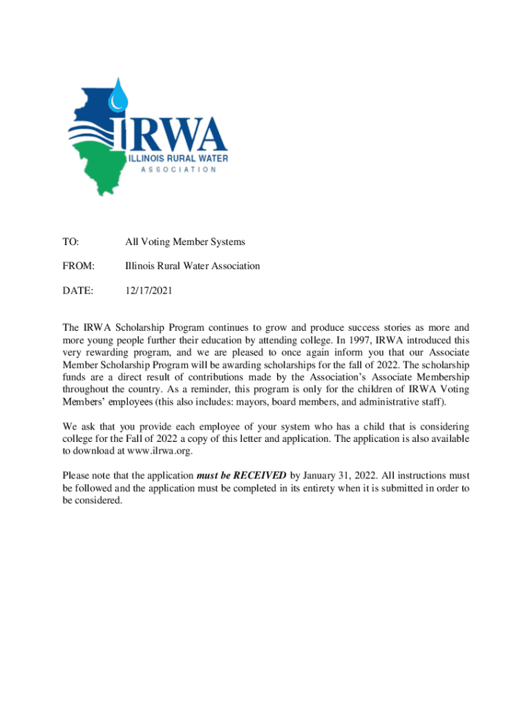 TO:All Voting Member SystemsFROM:Illinois Rural Water AssociationDATE:12/17/2021The IRA Scholarship Program continues to grow and produce success stories as more and more young people further their