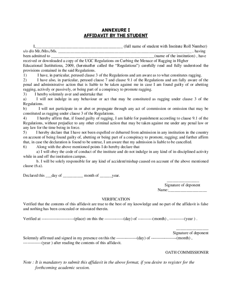 Appendix I AFFIDAVIT BY THE STUDENT I, ___ (full name of student with Institute Roll Number) s/o d/o Mr./Mrs./Ms. ___, having been admitted to ___(name of the institution), have received or downloaded