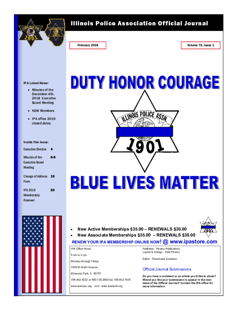 Illinois Police Association Official Journal February 2019Volume 72, Issue 1IPA The Latest News: Minutes of the December 4th, 2018 Executive Board Meeting NEW Members IPA Office 2019 closed datesInside
