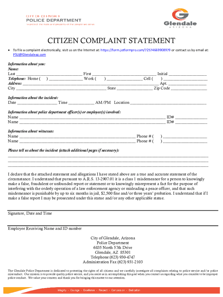 CITIZEN COMPLAINT STATEMENT To file a complaint electronically, visit us on the Internet at: https://form.jotformpro.com/72574669908979 or contact us by email at: PSU@Glendaleaz.comInformation about