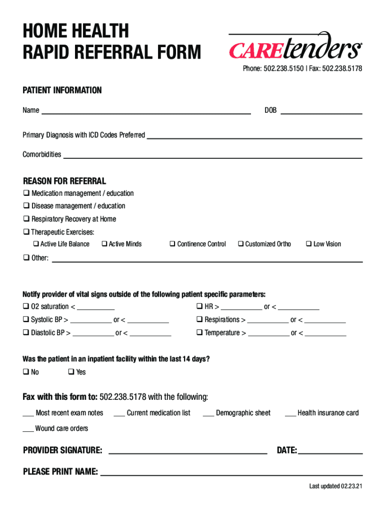 HOME HEALTH RAPID REFERRAL Hormone: 502.238.5150 | Fax: 502.238.5178PATIENT INFORMATION NameDOBPrimary Diagnosis with ICD Codes Preferred ComorbiditiesREASON FOR REFERRAL Medication management / education